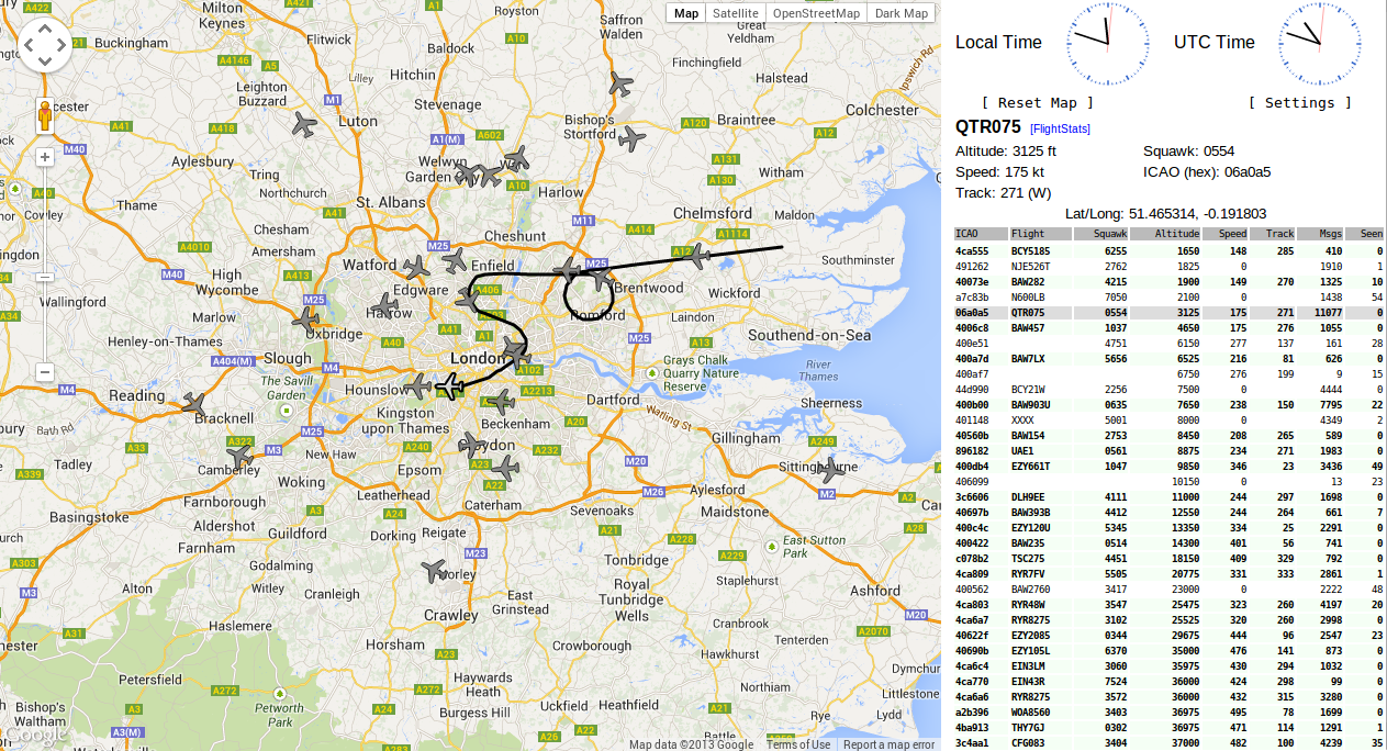 The key tool we need is called dump1090 and can be found on GitHub. The installation is really straightforward, thanks to an excellent blog post by David GM8ARV. There is actually several versions of dump1090 - original application created by Salvatore 'antirez' Sanfilippo and an extended one released by MalcolmRobb. There are differences under the hood as well as in the user interface. First of all, Malcolm's version includes improvements in decoding and processing functions. The difference became apparent when I switched from 'antirez' to 'MalcolmRobb' code base - the amount of airplanes picked up almost doubled, more planes had their flight numbers attached to them, etc. Another immediately visible change is the web interface - airplane icons replaced triangles and a panel was added to show the table with flights currently in range of our station (as seen in the screenshot above). Both versions can also show interactive table with the live data they receive - here's how it looks on my screen.